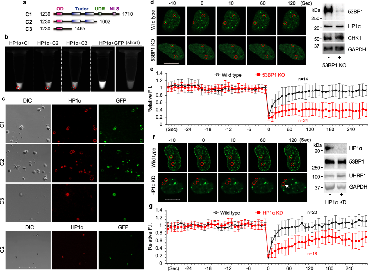 既往的研究普遍认为,53BP1以NHEJ (Non-Homologous End Joining)的方式参与双链DNA断裂修复并以此维持真核生物细胞基因组的完整性。然而,在没有发生DNA损伤的情况下,53BP1的功能尚待发现。该研究对细胞DNA损伤修复应答的关键蛋白53BP1进行了全新的功能解释,发现在未发生DNA损伤时,53BP1定位于异染色质区域,与异染色质蛋白1(HP1)一起,通过蛋白液液相分离的方式维持异染色质的转录沉默状态,抑制异染色质区域内源性逆转录病毒的表达,以此维持真核生物细胞基因组的稳定性。该研究同时对53BP1进行液液相分离的关键结构域和氨基酸进行了鉴定。当细胞中缺乏53BP1或上述关键区域发生突变时,细胞由于异染色质结构的丧失导致了有丝分裂障碍或提前进入衰老状态。上述发现首次发现了53BP1蛋白的全新功能,开创了针对53BP1以及DNA损伤修复蛋白的功能研究的崭新的方向,也为以此开发抗肿瘤药物,以及治疗由于基因组不稳定导致的衰老及退化性疾病提供了新的理论支持。