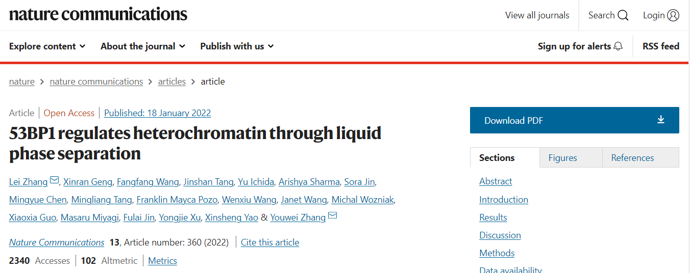 1月18日,我校生物工程与食品学院教师张雷副教授在国际刊物Nature子刊 《Nature Communications》(影响因子:14.91,中科院1区Top杂志,H指数248)发表题为”53BP1 regulates heterochromatin through liquid phase separation“的研究论文(DOI: 10.1038/s41467-022-28019-y)。张雷副教授为第一作者兼共同通讯作者,团队青年教师陈明月博士,研究生王文秀等参与了此项研究工作。