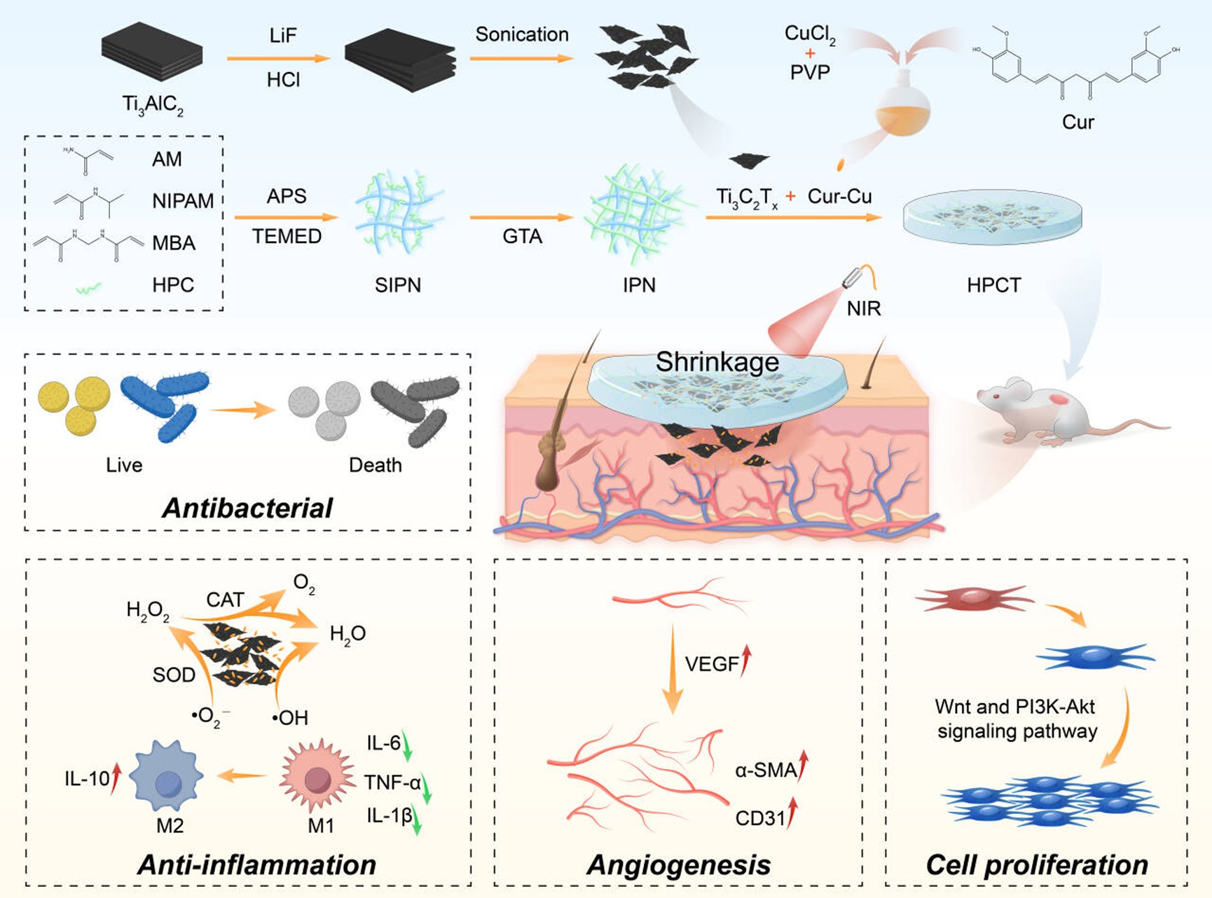 MXene具备优异的光热转换与自由基清除能力,在近红外激光照射下可产生热效应,触发水凝胶收缩,实现药物的可控释放。同时其二维结构还能破坏细菌细胞膜,发挥抗菌作用。另一方面,姜黄素-铜复合纳米颗粒具有良好的抗氧化、抗炎和促血管生成能力,其中铜离子还能刺激血管内皮生长因子表达,从而促进内皮细胞迁移与血管新生。转录组学分析进一步表明,该复合水凝胶还能激活PI3K-AKT和Wnt信号通路,在分子层面促进组织再生。体内实验表明,该水凝胶显著加速糖尿病小鼠创面愈合,同时促进胶原沉积与血管生成,展现出良好的治疗潜力。
