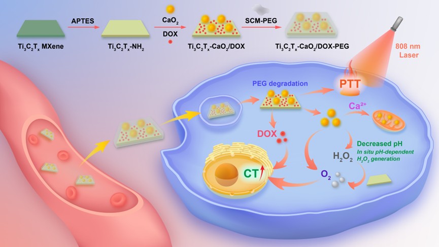 随后,该团队针对Ti3C2Tx MXene纳米片类过氧化氢酶活性弱、对肿瘤乏氧改善不佳的问题,将其与CaO2纳米粒子复合,实现了肿瘤部位的自供氧,有效改善肿瘤乏氧。结合低温光热治疗与氧增敏化疗,可有效抑制肿瘤生长,展现出良好的治疗潜力。相关研究以文题“Multifunctional MXene-based nanosheets with self-supply oxygen capability for combination tumor therapy”发表于国际知名期刊Chemical Engineering Journal(一区top,影响因子13.2,原文链接:https://doi.org/10.1016/j.cej.2025.170602)。湖北工业大学为第一完成单位。李草教授、匡映副教授与广东医科大学刘允副教授为论文的共同通讯作者。
