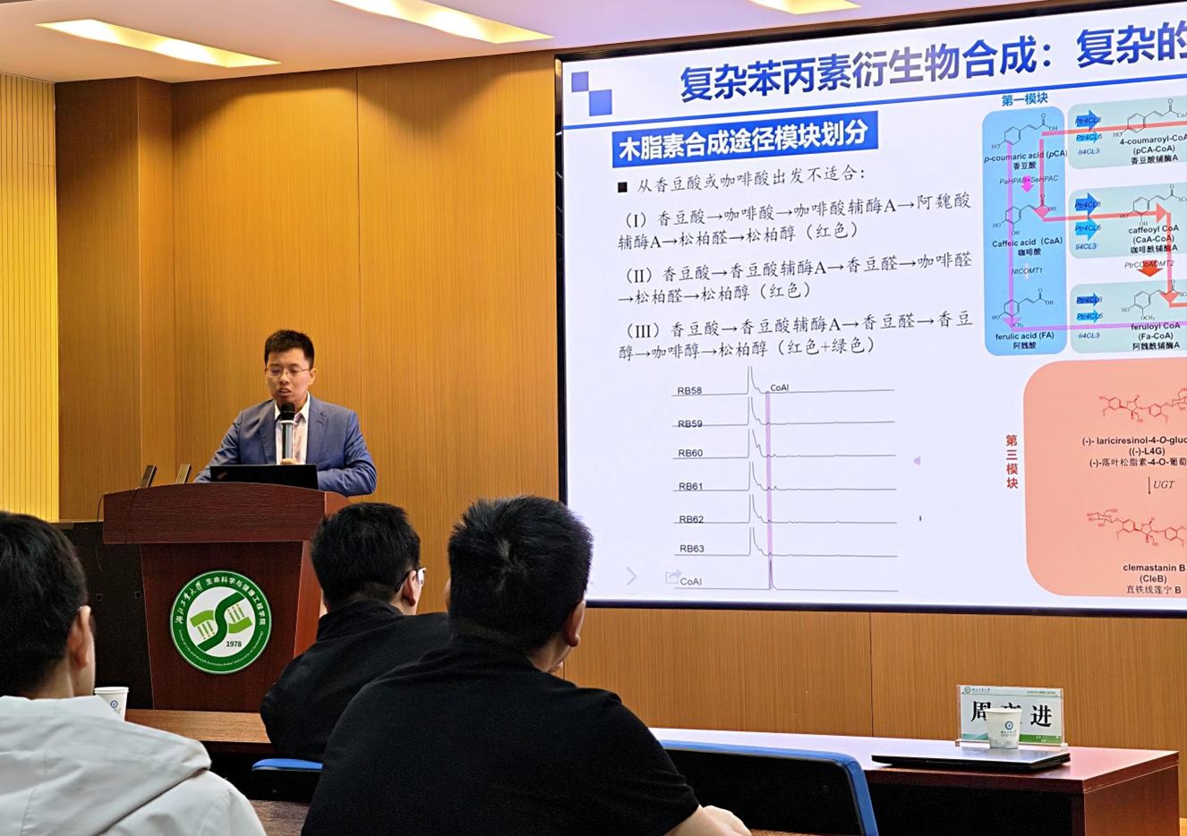 周雍进为师生们分享了题为“从酿造到智造:高效酵母细胞工厂设计”的报告。报告中,周雍进围绕酵母细胞工厂的构建思路,系统介绍了酵母作为绿色生物制造宿主在生长速度、培养操作和工程改造等方面的优势。结合团队在合成生物学与代谢工程领域的研究进展,他重点阐述了如何通过底盘优化、路径设计和工具开发,提升酵母对天然产物及重要化学品的合成效率,并介绍了非常规酵母遗传操作平台的构建思路。围绕甲醇这一低成本、易获取的一碳原料,周雍进进一步分享了团队在甲醇酵母代谢工程改造方面的探索。其团队近年来持续推进甲醇高效生物转化、辅因子工程优化以及细胞器代谢耦联研究,为高附加值化学品和天然产物的绿色制造提供了新的技术路径,也展现出合成生物学服务可持续生物制造的重要潜力。